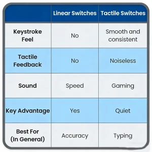 • Linear Actuation: If you prefer smooth, rapid keystrokes with minimal noise, linear switches are your best option. They’re especially favored by gamers for their speed and silence.